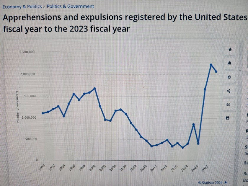 I believe that Trump, even with his flaws, is better as a leader than the Democratic party has shown themselves to be as a group this past 3 1/2 years. I believe that the border issue by itself makes this clear. It is an undeniable fact that the border was enormously better under his administration. Here is a graph of statistics from the department of Homeland Security. The rightmost 3 dots, where the chart goes vertical, are 2021, 2022, and 2023.