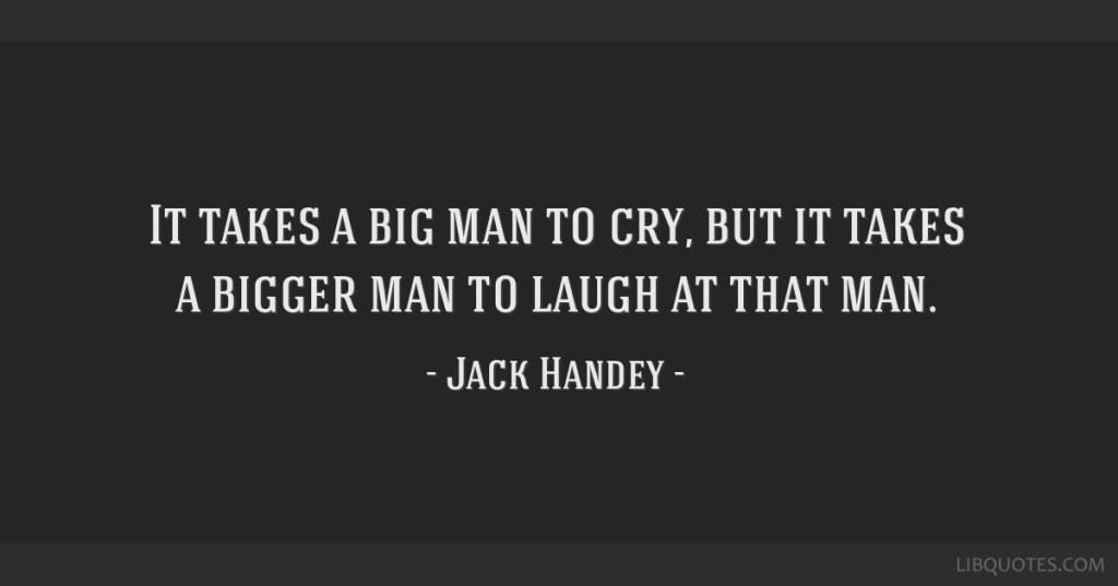 There is no stigma about crying if you are a woman, but it is viewed as unmasculine if you are a man. Yet most if not all men have cried at one time or another. Of course most men I think prefer to cry in solitude if they feel the need. Life can be incredibly painful on many levels. A lot of time as men, we stuff all of our pain and sadness down without letting it surface, out of fear of appearing weak, or even fearing that it means that we are weak. Yet I have seen videos of Dennis Rodman and Mike Tyson, two of the baddest mofos ever to walk the earth, and there is footage of them crying like babies. There is nothing wrong with that at all, we’re all human and sometimes need to release pain and sadness. Sometimes it comes out when we are holding too much of it in.