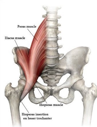 Hip flexion occurs at the hip joint, and involves bringing the leg forward/knee closer to the chest from a standing position. It is important in activities like running, walking, and kicking. The psoas muscle is listed as one of the primary hip flexors. It is considered by some in yoga circles to be the most important muscle in the body, because it connects the upper body to the lower (specifically the lower lumbar spine and pelvis to the legs). In trying to address my low back issues, I recall a chiropractor having me lie down on my back on a table, bring my knee up to 90 degrees, and resist as he tried to pull my leg down. Since I was able to exert a lot of resistance, he determined that my hip flexors were strong. The reason mine SEEMED strong is that one of the other primary hip flexor muscles is the rectus femoris (the green muscle pictured). This muscle is the superficial and outermost quad muscle and the only quad muscle that is a hip flexor since it has its origin on the upper front part of the pelvis (the others have their origin on the femur itself and are used exclusively for knee extension). I did a lot of squats at the gym and used to do some moderate distance running, and had very strong quads. But just because I was able to exert a lot of resistance did not mean that ALL of my hip flexor muscles were strong (or that all of my quad muscles were, for that matter… the quads consist of 4 different muscles). My rectus femoris was not only strong, but overdeveloped, while deeper muscles like my psoas (and iliacus, pictured) were actually weak. So only the superficial aspect of hip flexion was strong, hiding weakness in deeper muscles.